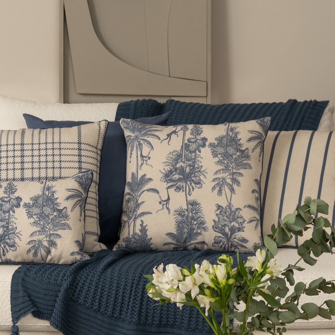 ALMOFADA EM LINHO CRU 52 X 52 ESTAMPADA COM LISTRAS COM CORDÃO AZUL COD 424-92
